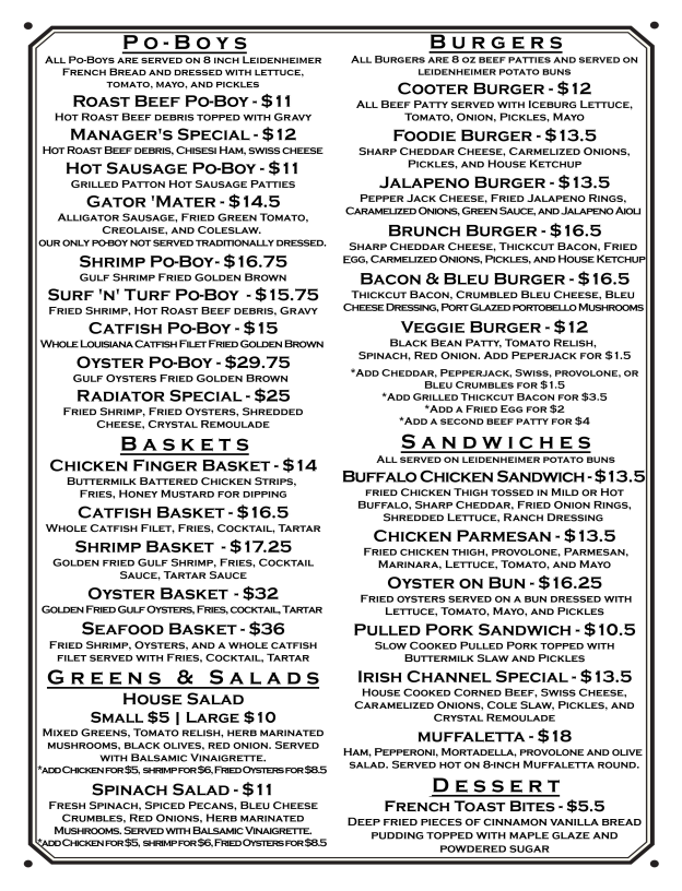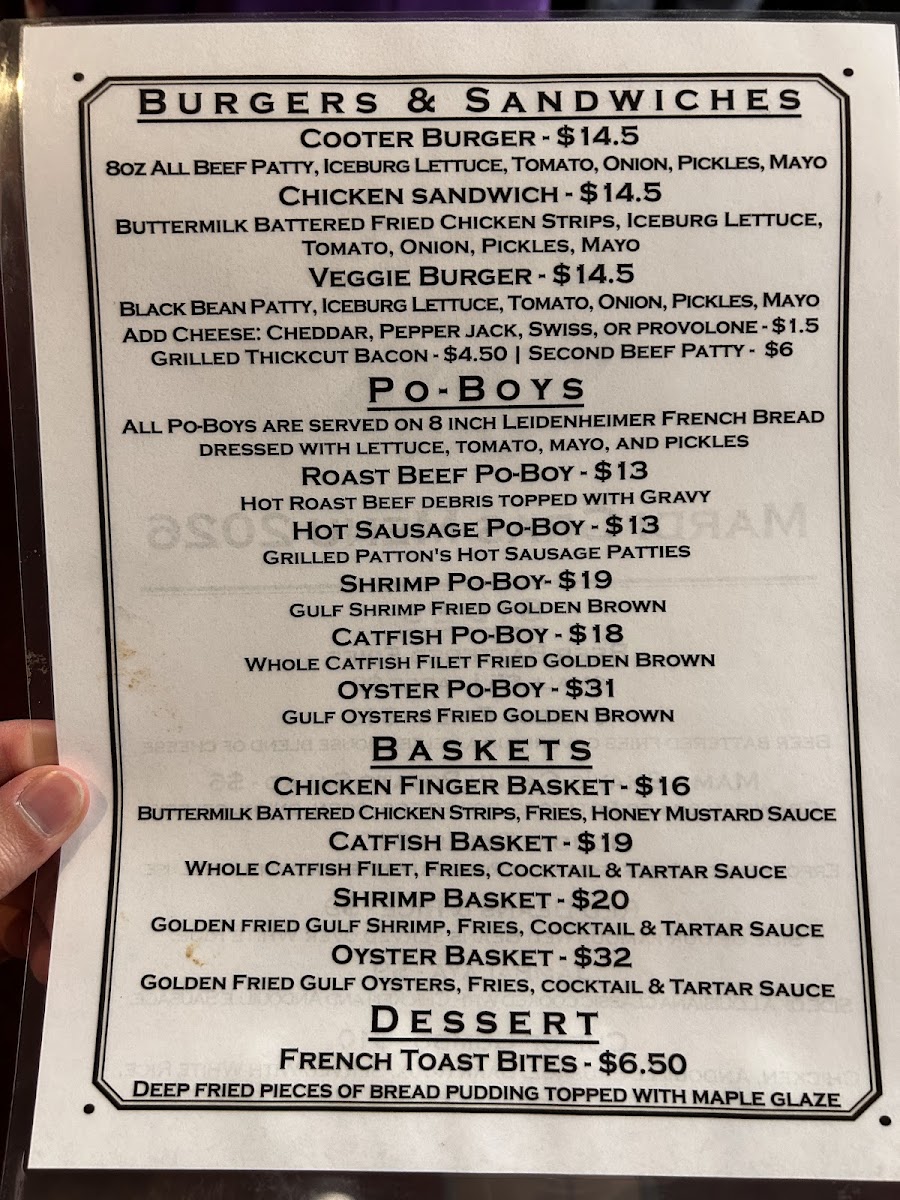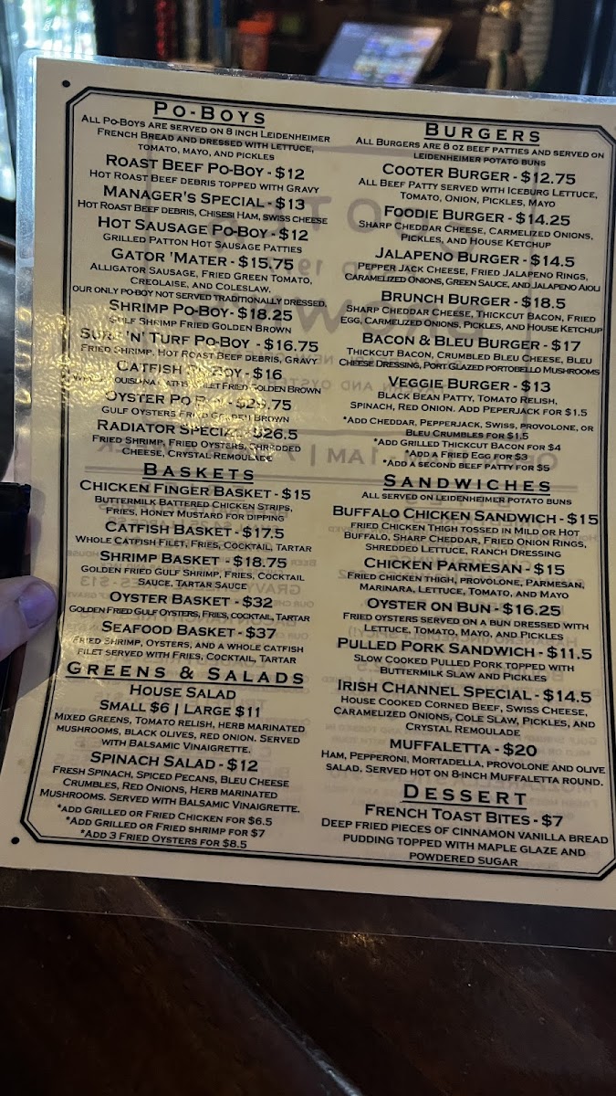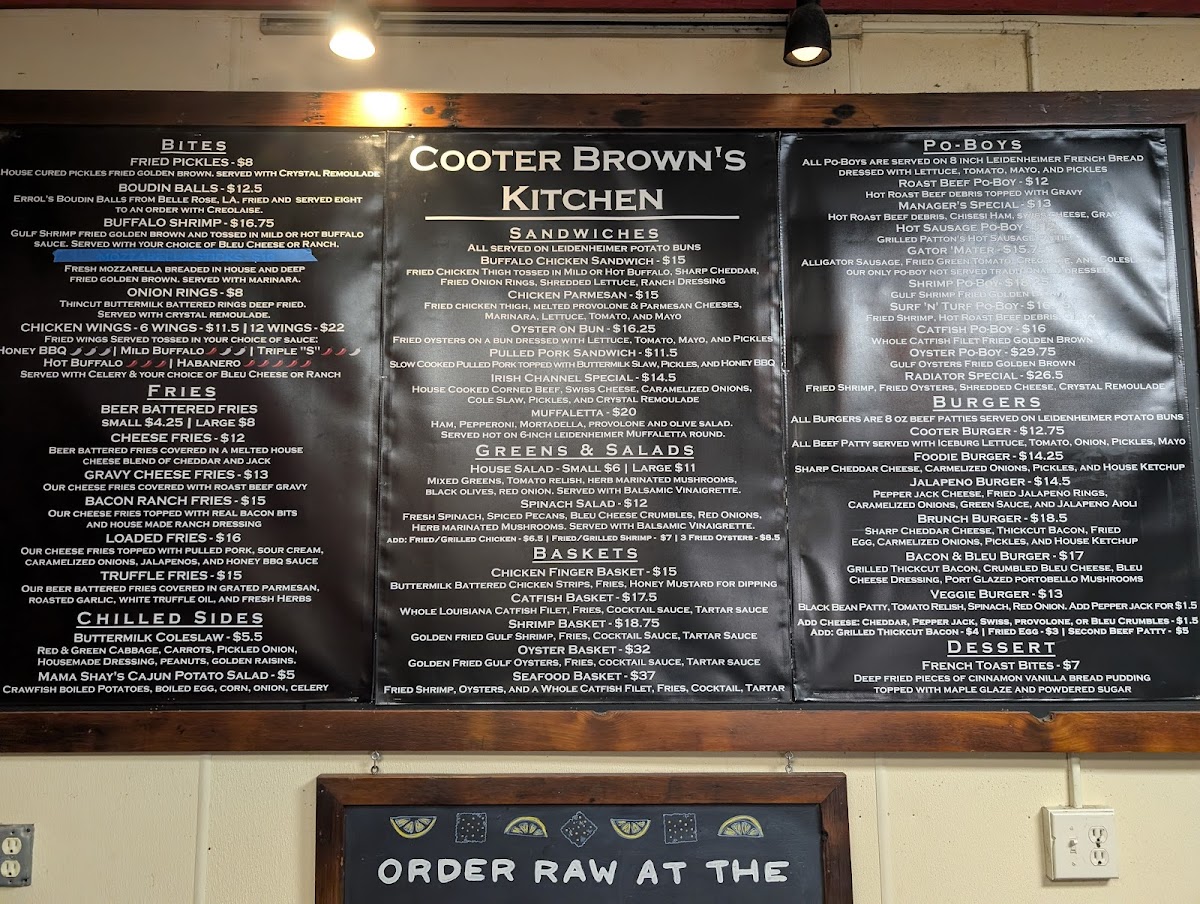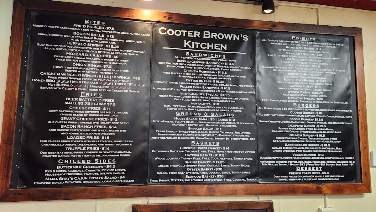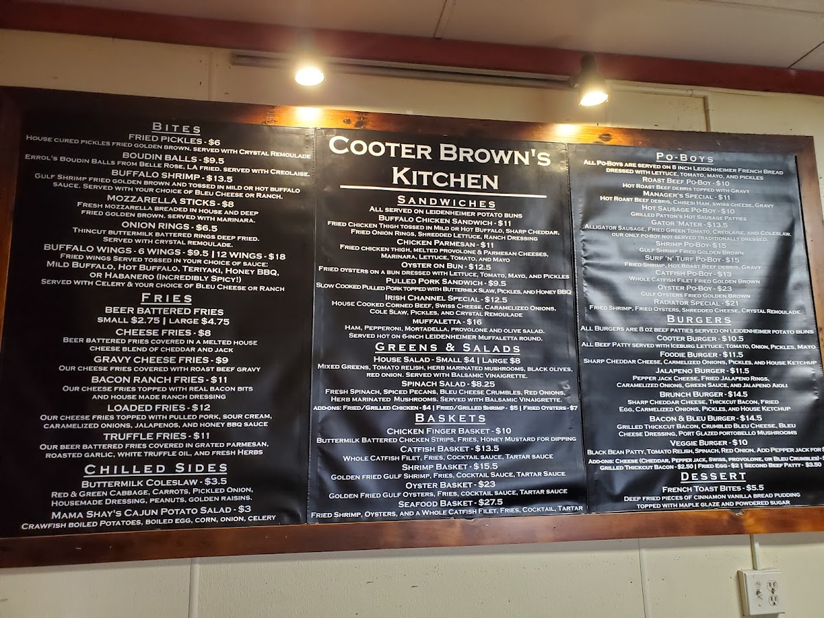 Cooter Brown's Tavern in New Orleans is a lively oyster bar and American bar & grill that perfectly blends casual vibes with bold flavors. Their menu shines with standout dishes like the beer-battered fries elevated by house-made cheese blends, savory gravy, real bacon bits, and pulled pork toppings—each variation a comforting indulgence. The Po’Boys are a true homage to local tradition, featuring classics such as hot roast beef debris smothered in gravy, spicy hot sausage patties, and the unique Gator ‘Mater with alligator sausage and fried green tomatoes. Seafood lovers will appreciate the crispy, golden Gulf shrimp Po’Boy, a quintessential New Orleans treat.